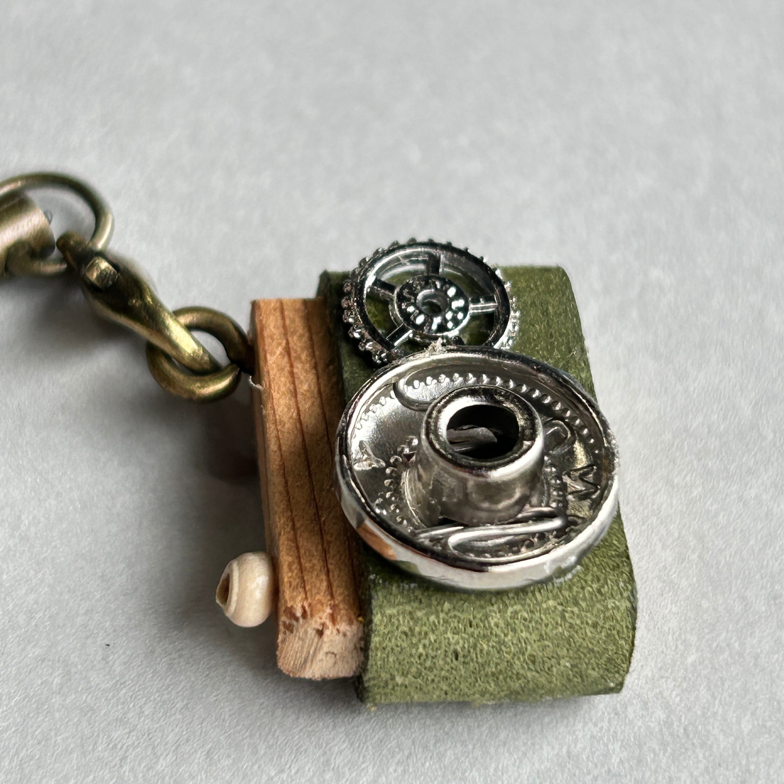 木の欠片、本革、スナップボタン、そして歯車パーツを使用しています。